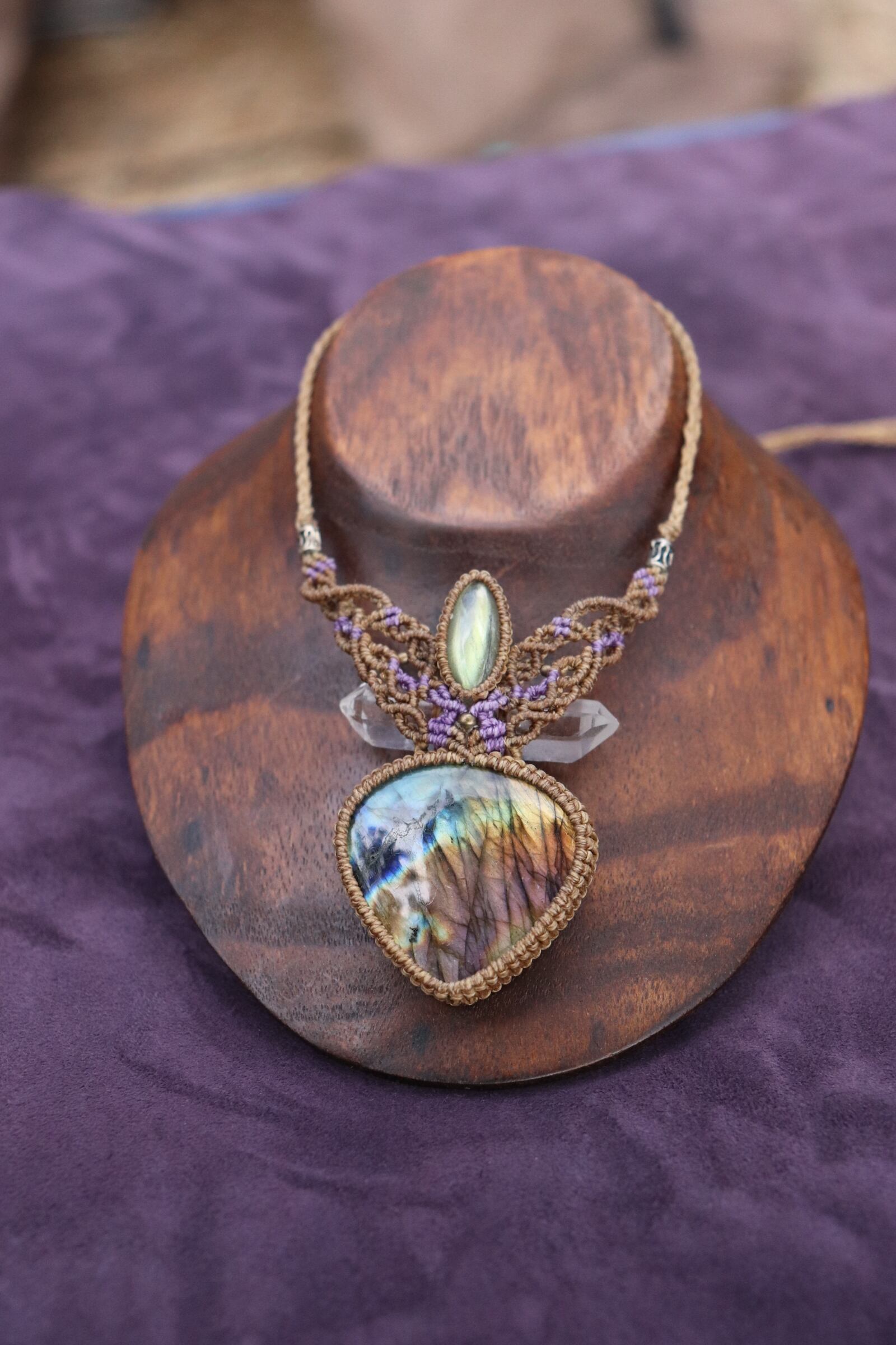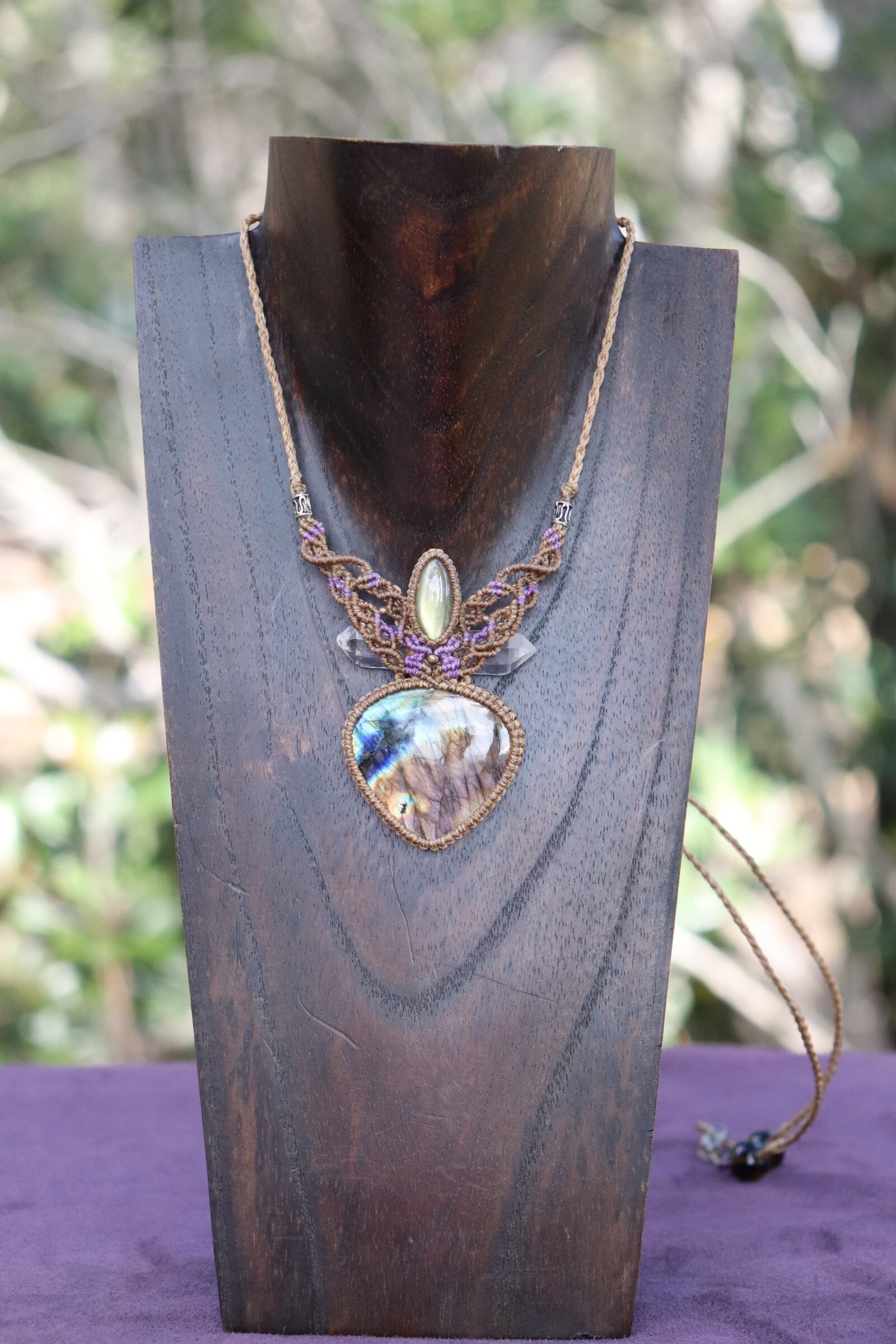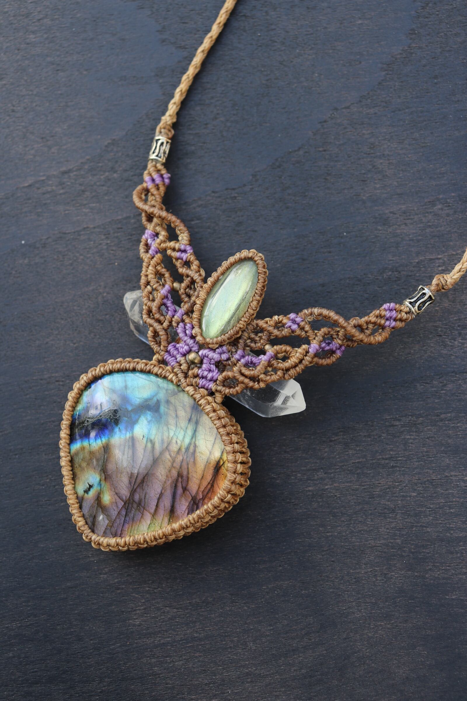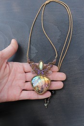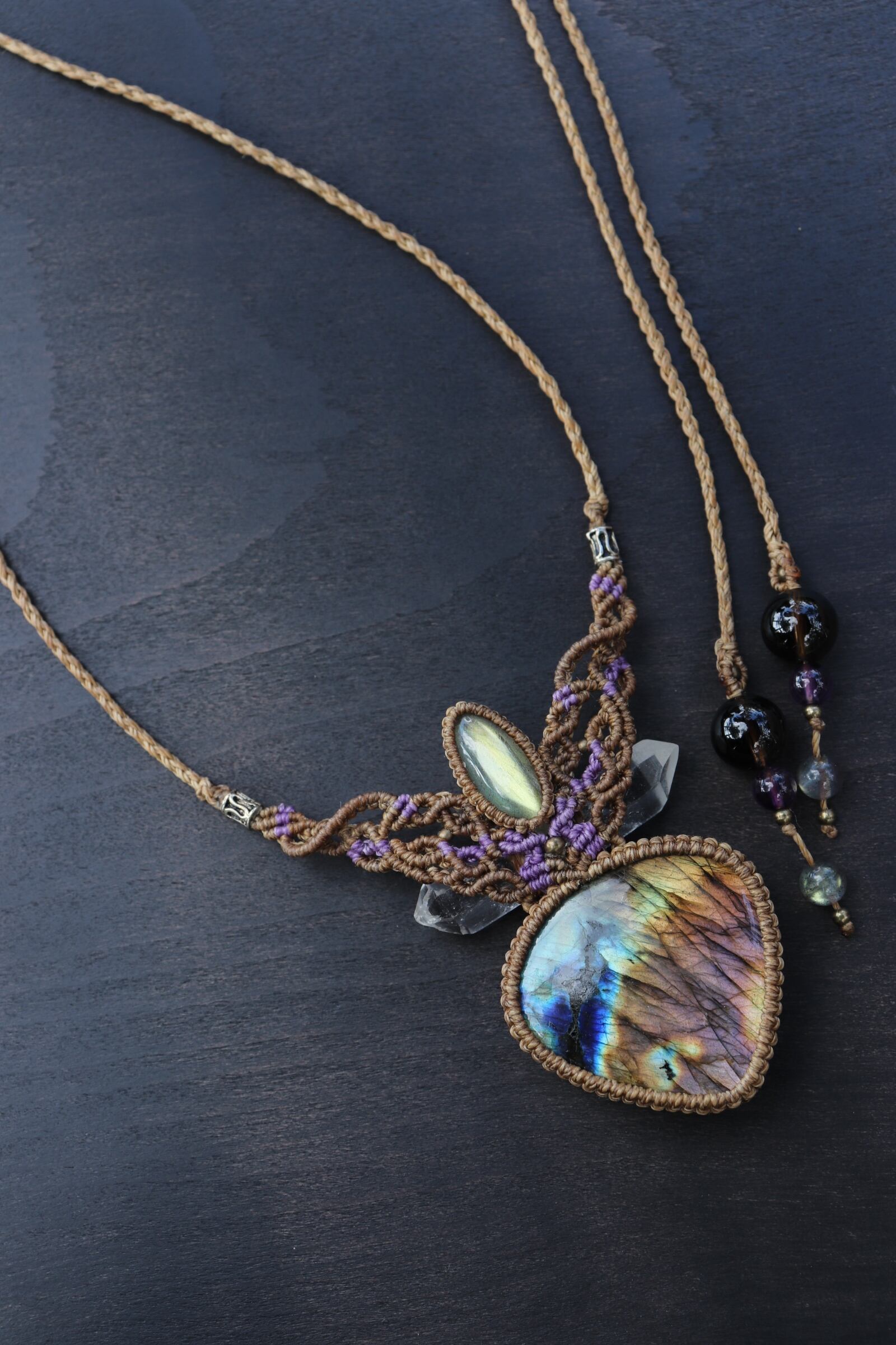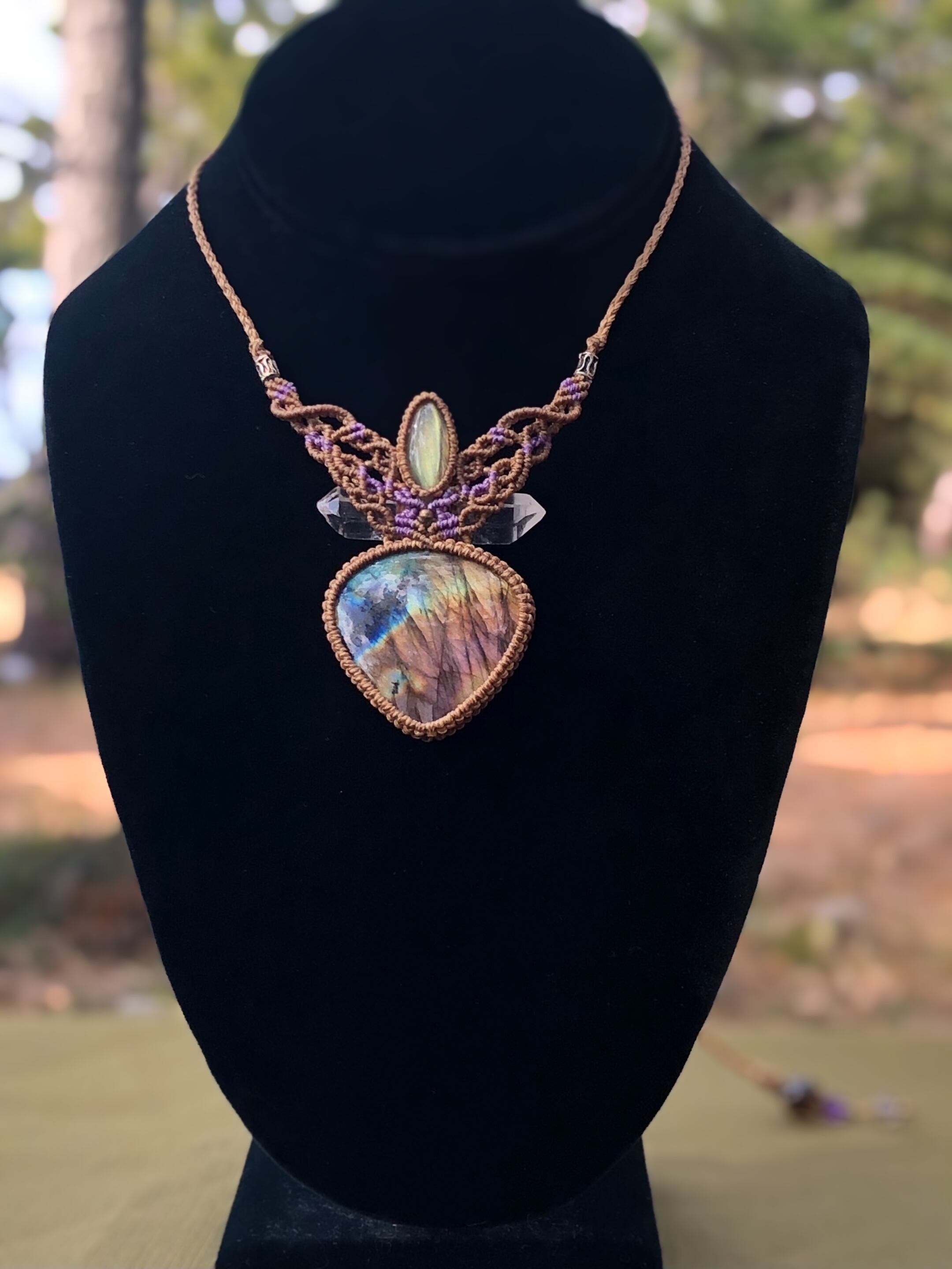 グリーンがかったイエローのラブラドライト、透明度の高い両剣水晶を連結させたデザインネックレスです。