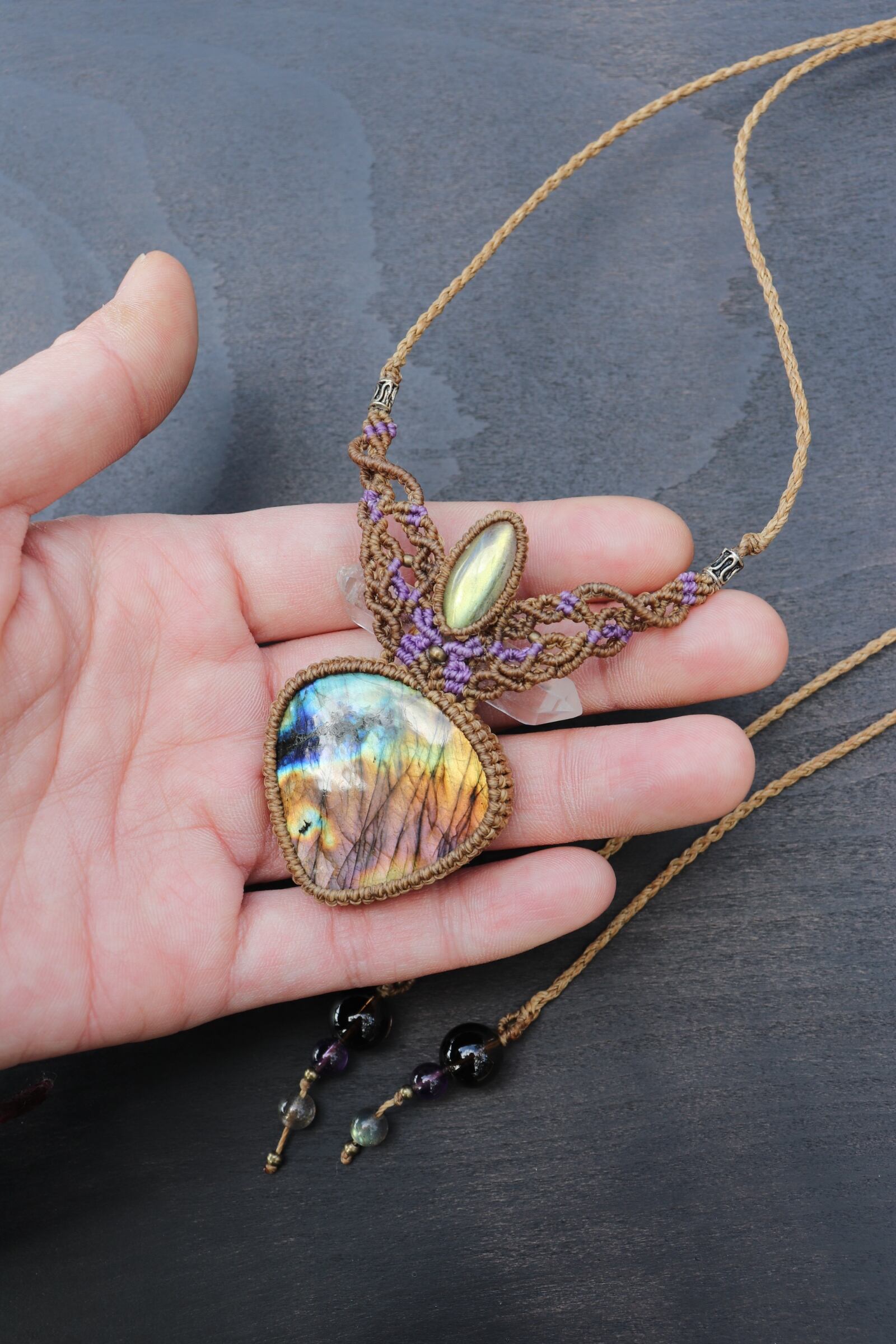 ブルー、グリーン、イエロー、ブラウン、パープルの多彩なグラデーションが美しいマルチカラーラブラドライトをメインに、