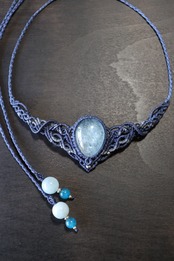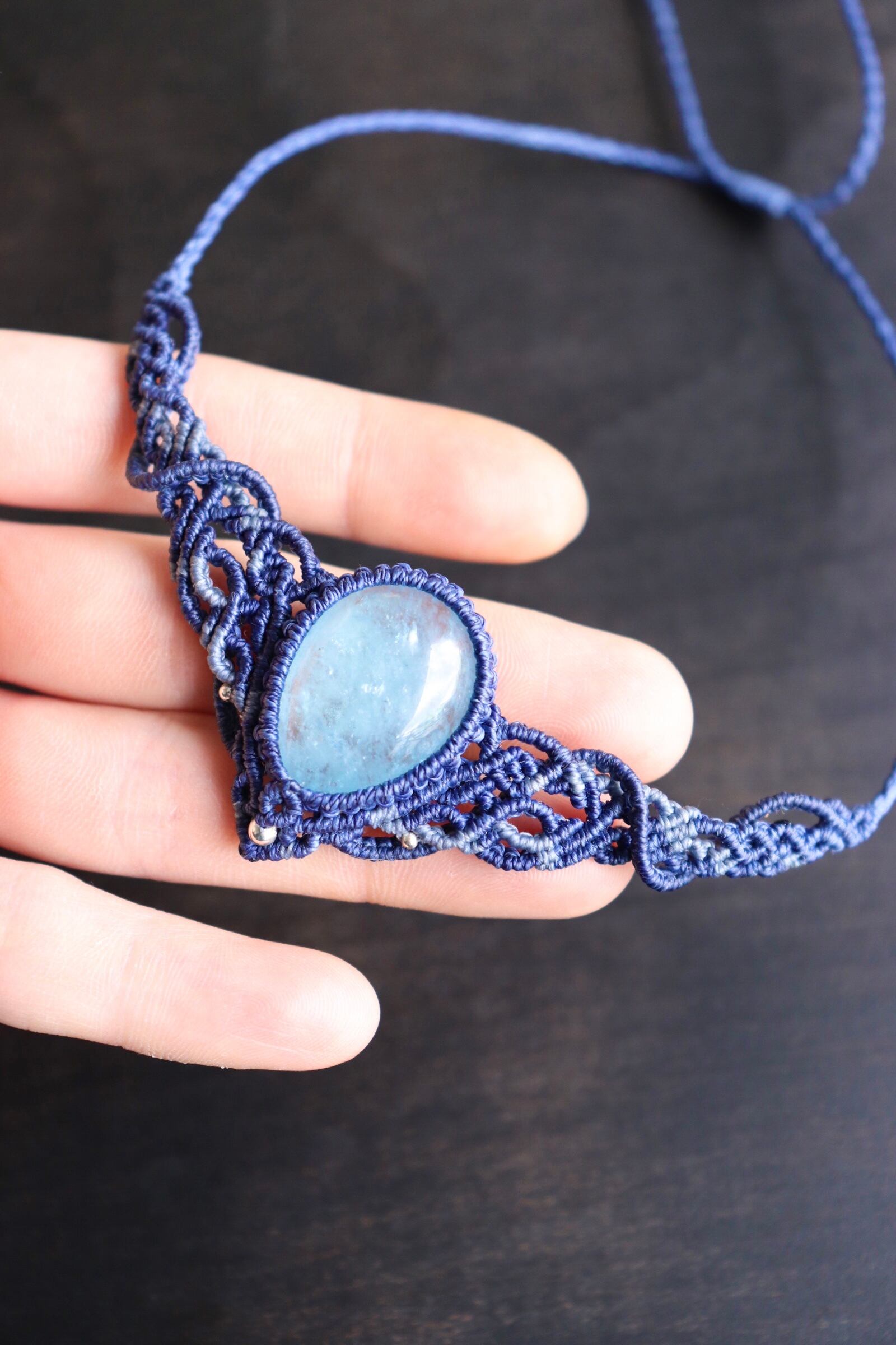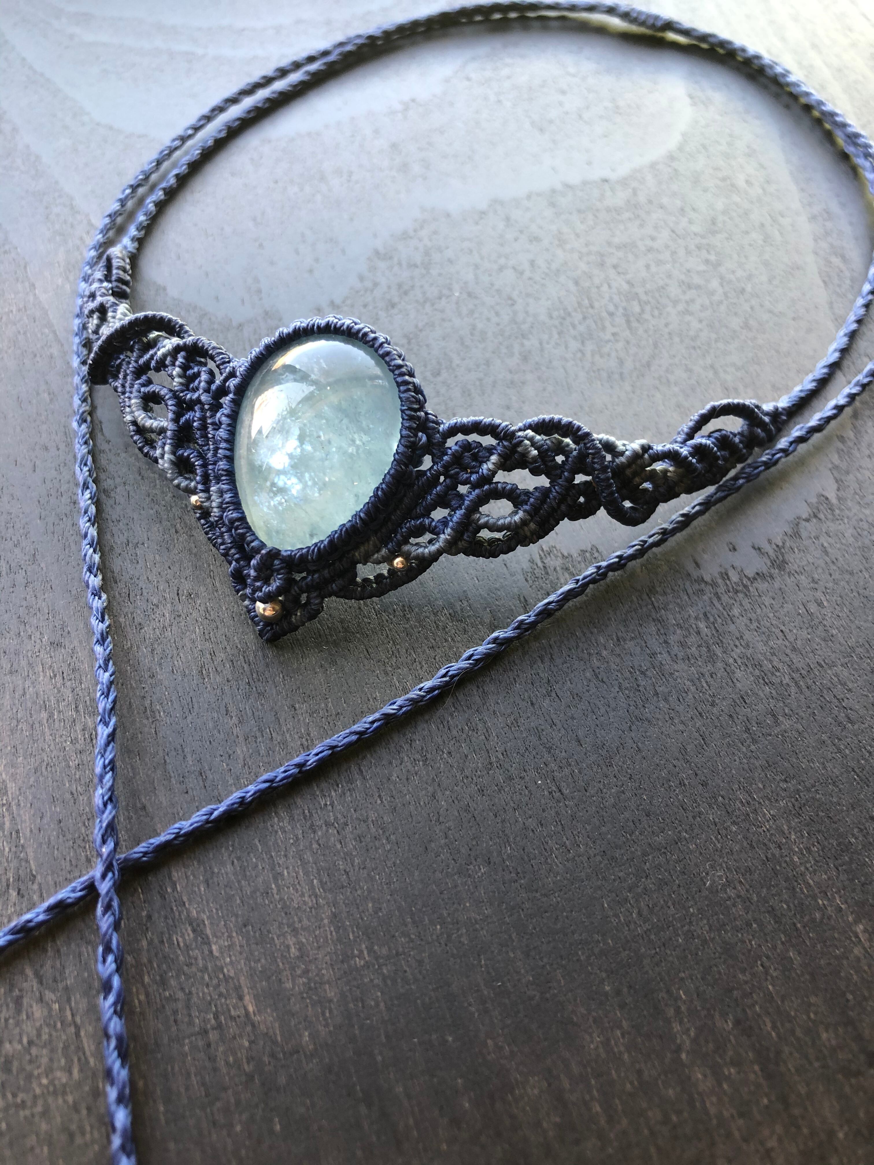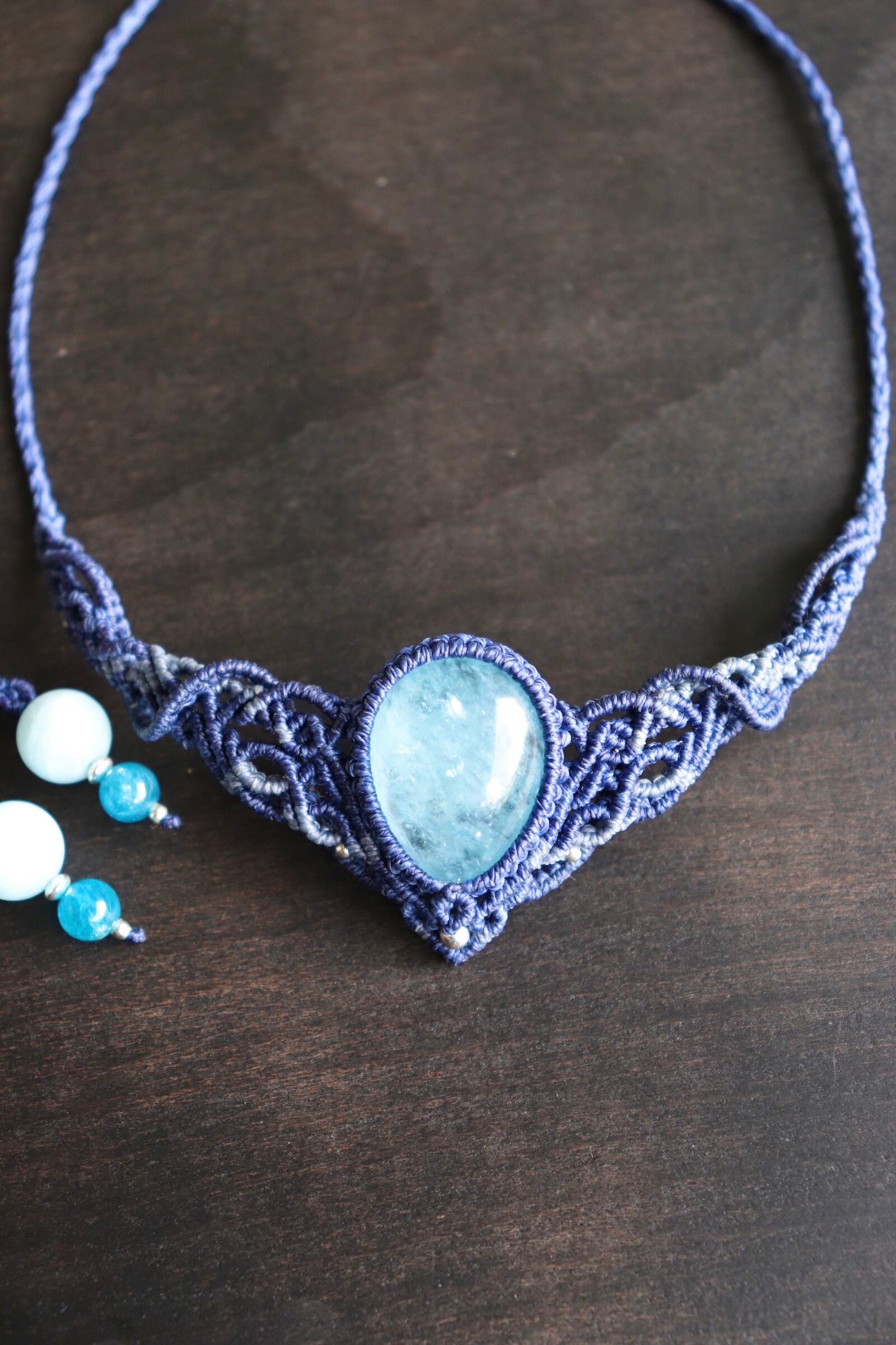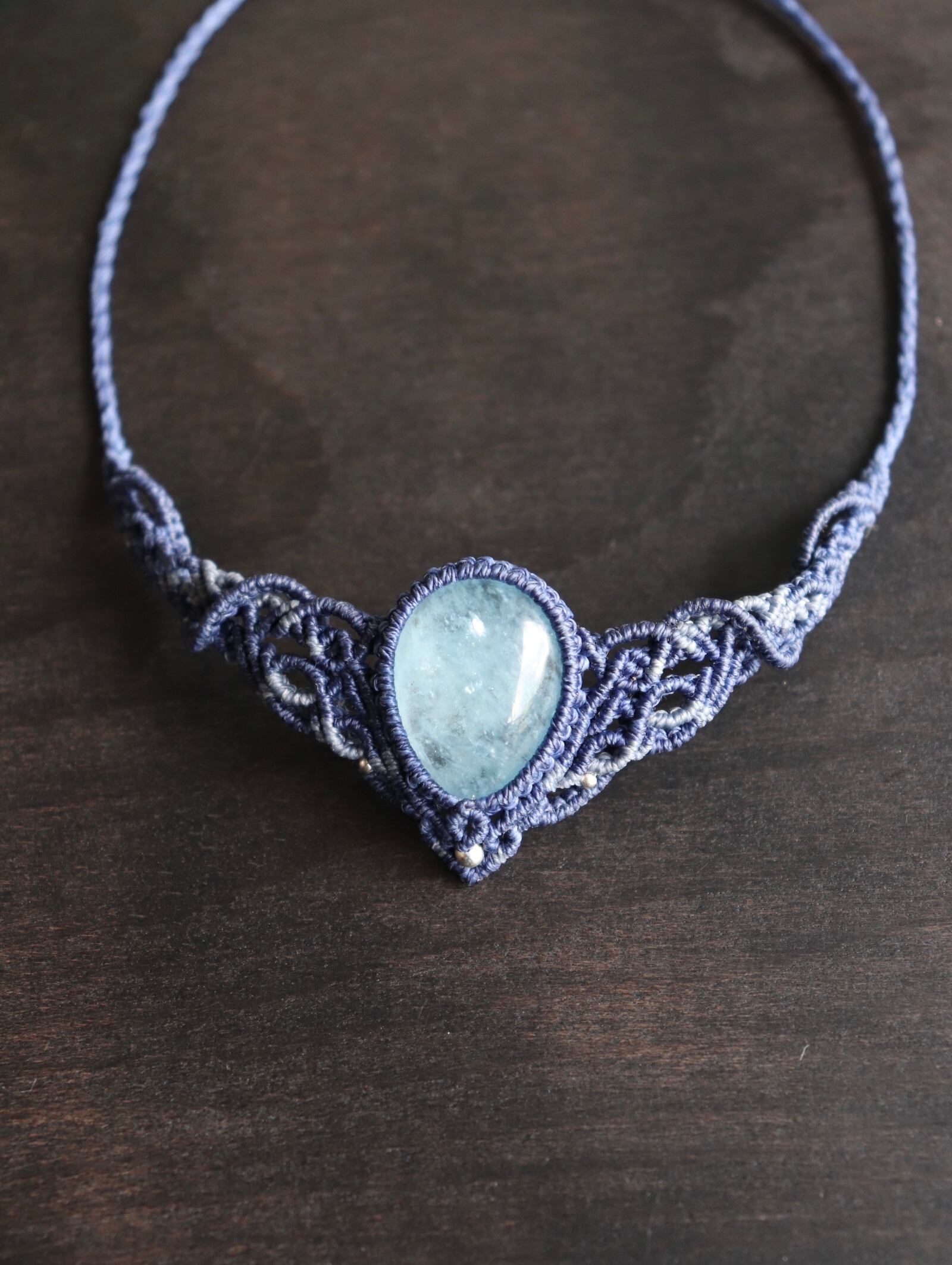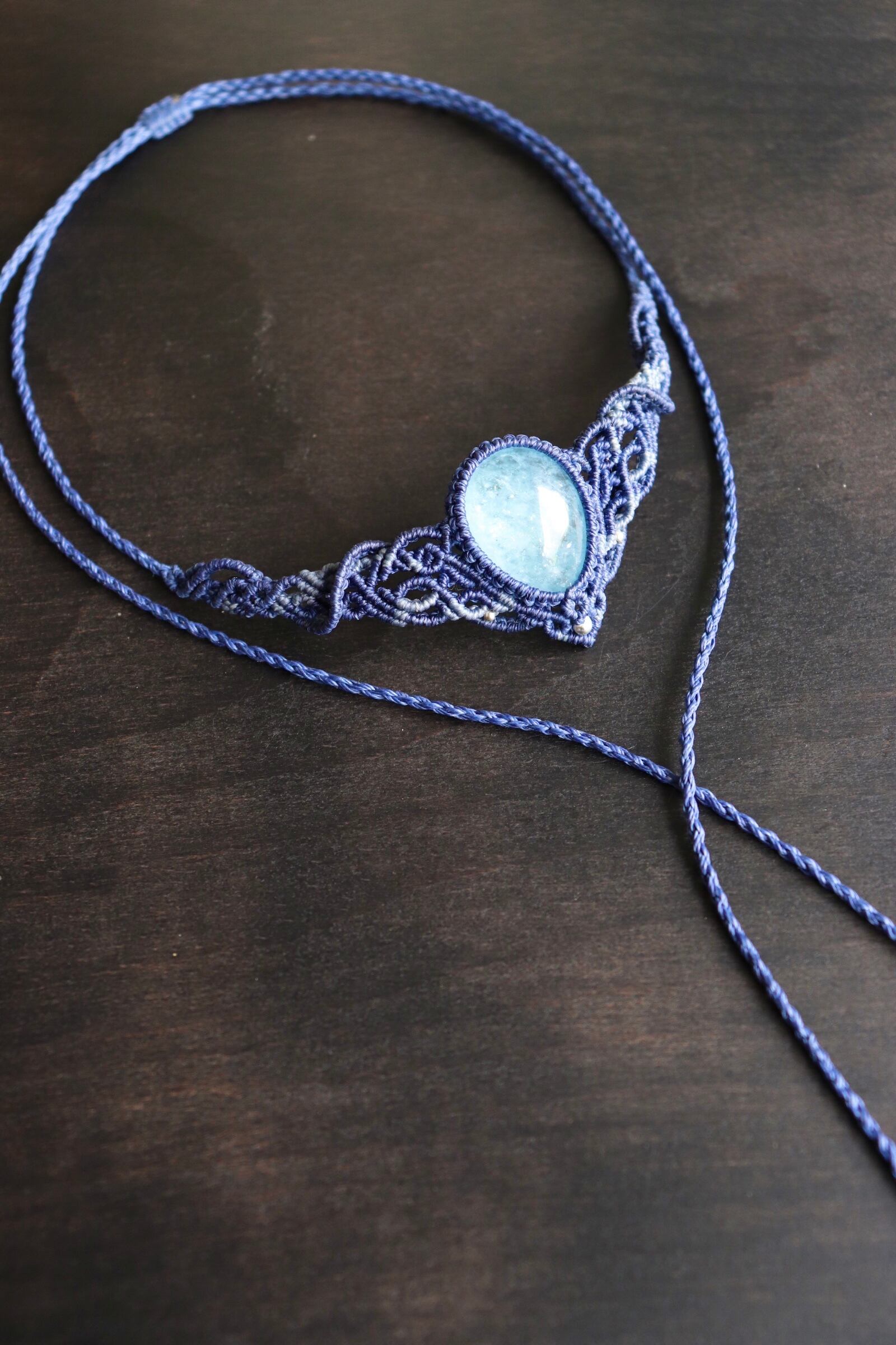 アクアマリンの色味に合わせて2色のコードを使い、繊細な編み目を施しました。