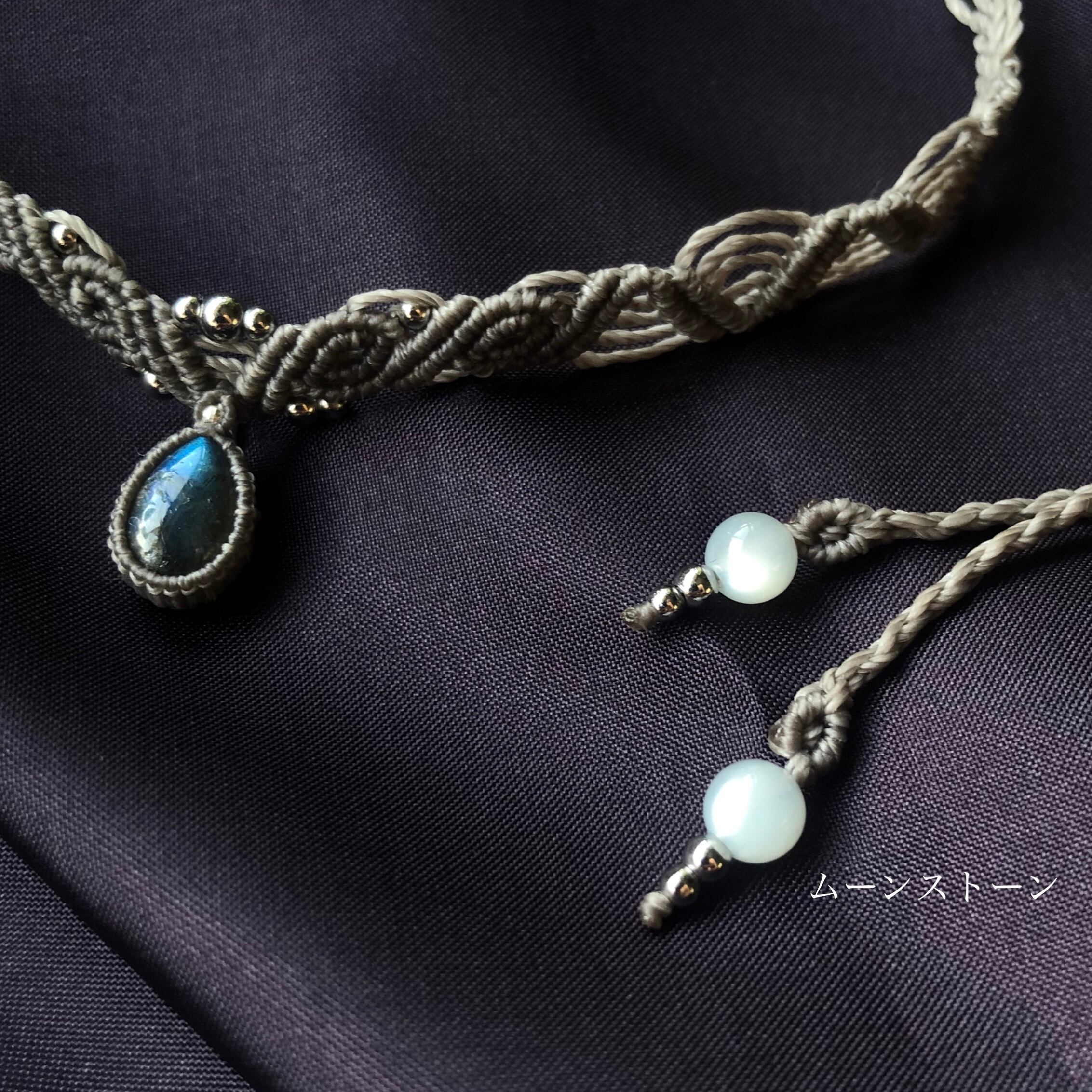紐エンドにはパールの様な輝きのムーンストーンをあしらいました。