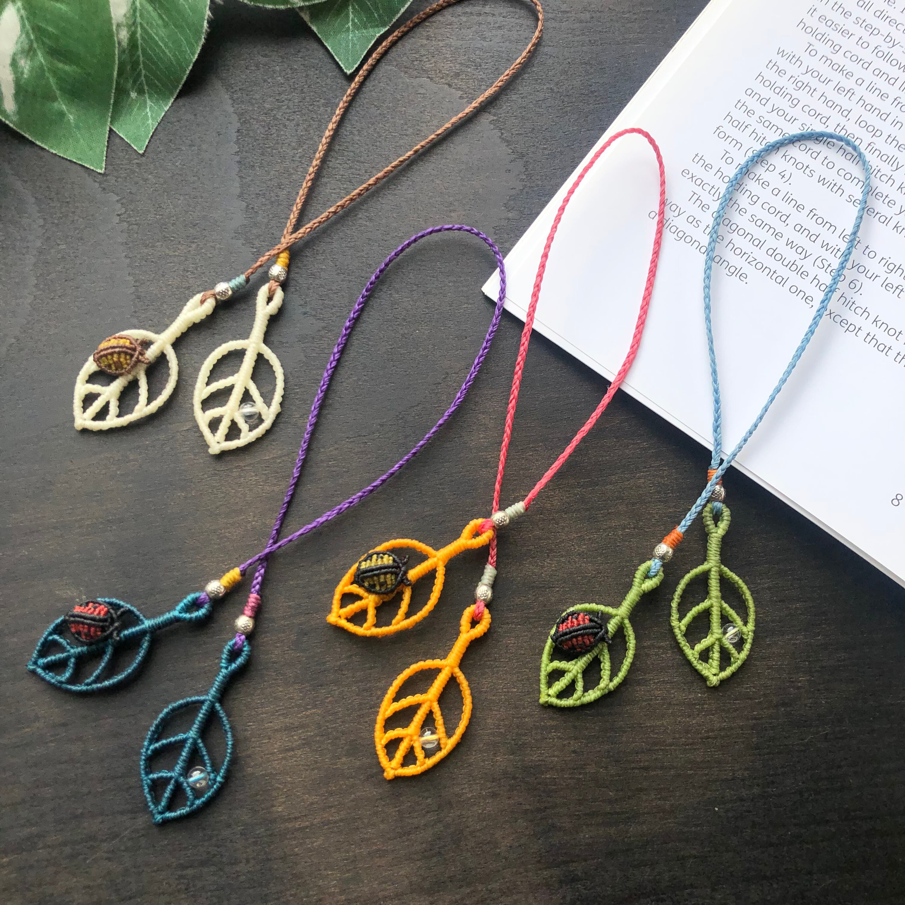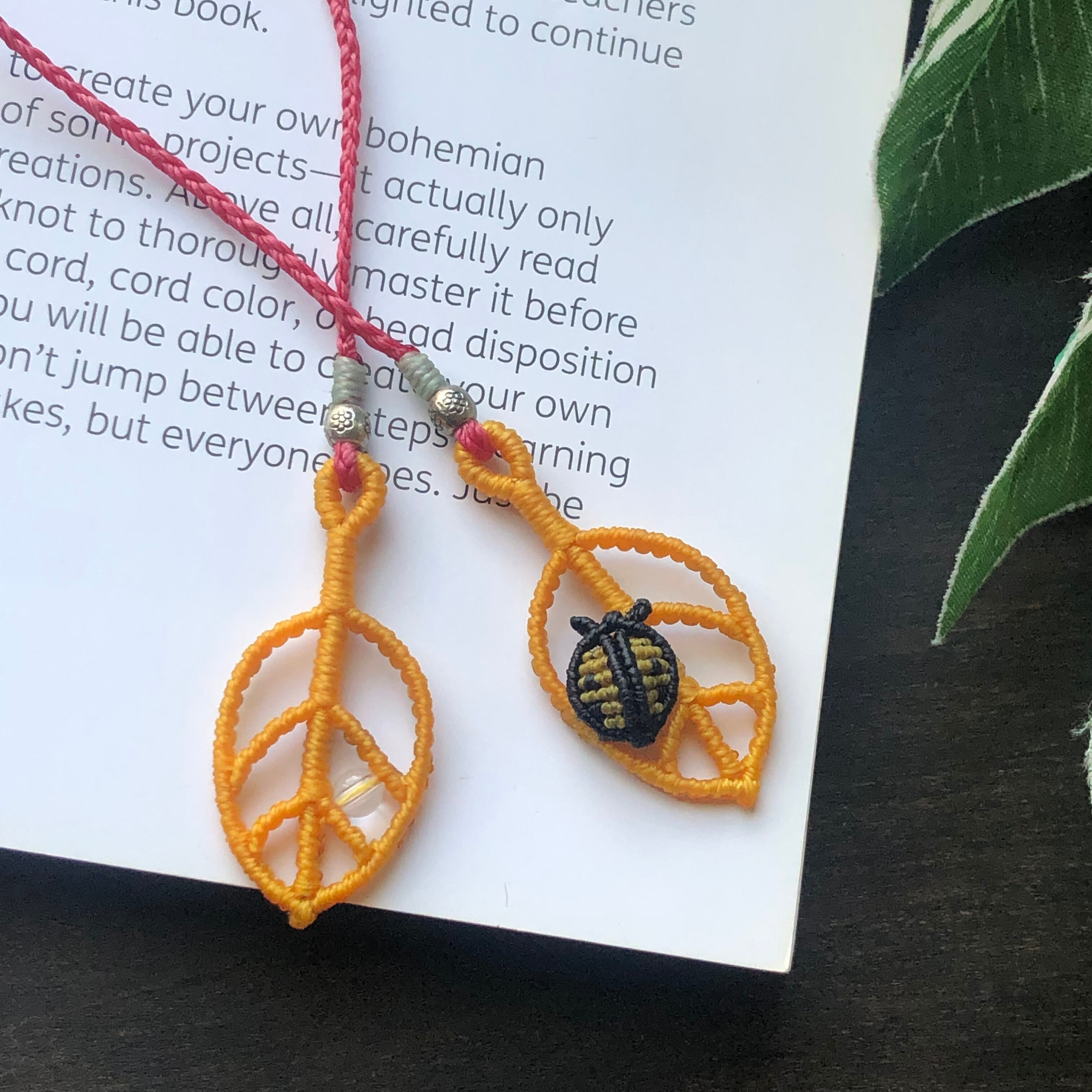 葉っぱに乗った小さなてんとう虫モチーフのマクラメブックマーカー(しおり)です。