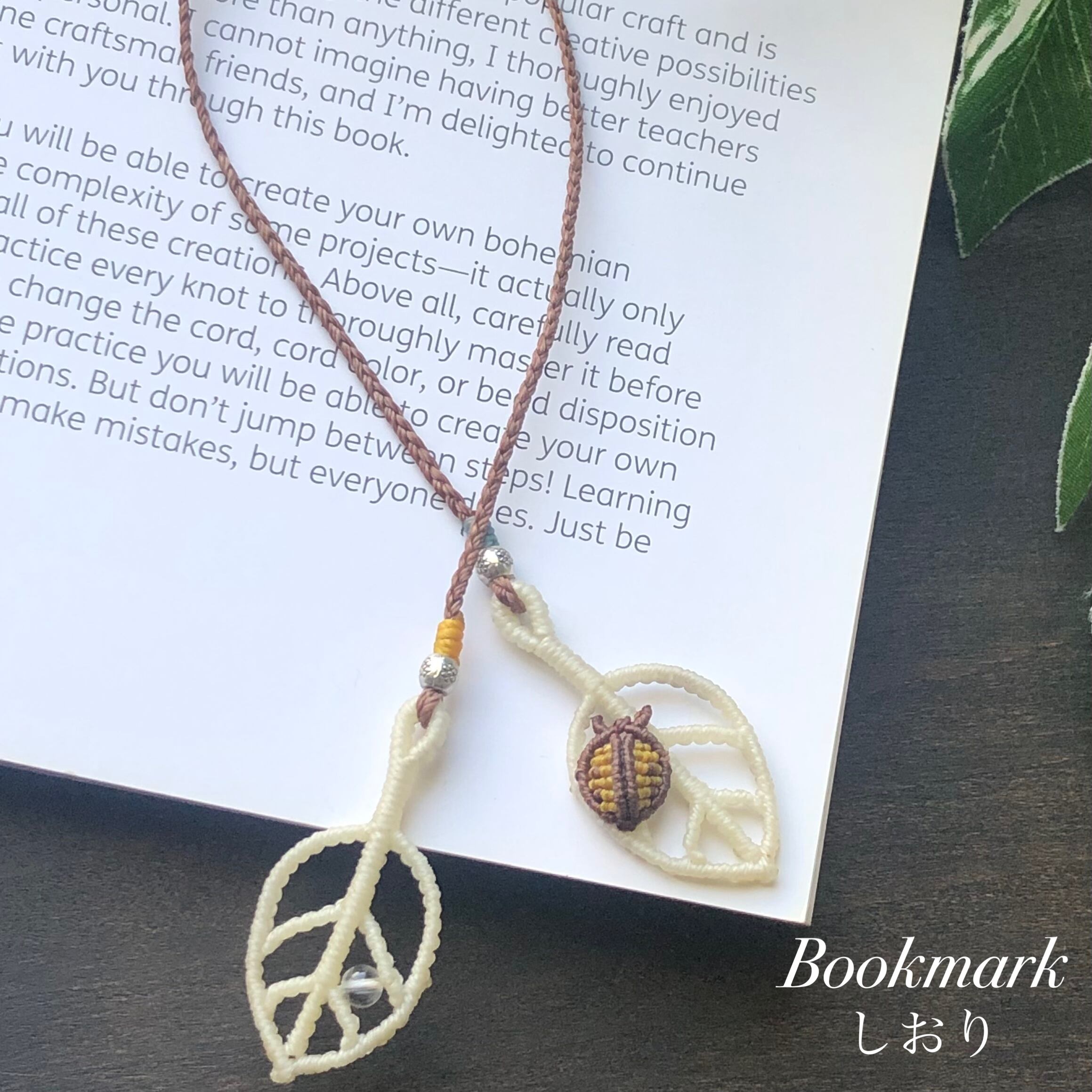 葉っぱに乗った小さなてんとう虫モチーフのマクラメブックマーカー(しおり)です。